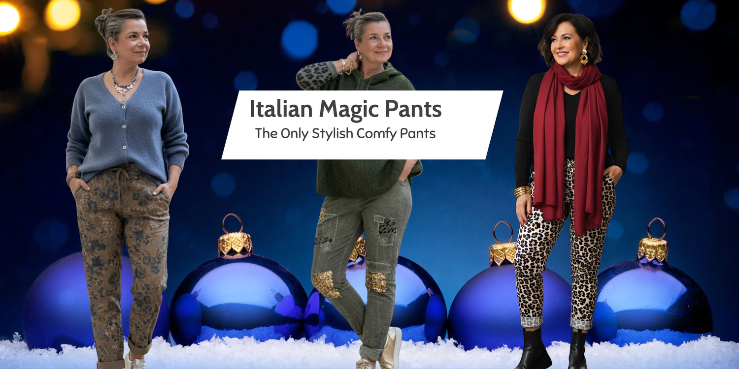 Our Italian Magic pants have a drawstring waistband allowing you to tighten or loosen as needed. No zippers or buttons that dig into the skin, just comfort.