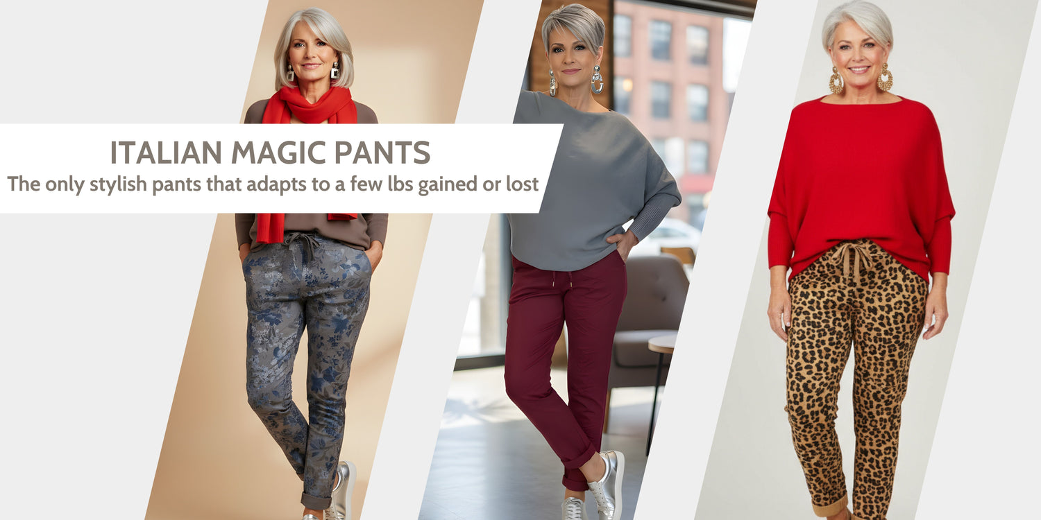 Our Italian Magic pants have a drawstring waistband allowing you to tighten or loosen as needed. No zippers or buttons that dig into the skin, just comfort.
