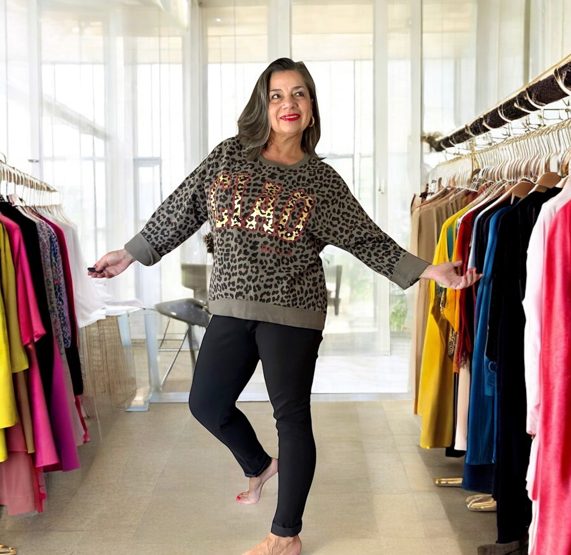 Discover the “CIAO BELLA” long sleeved & lightweight animal print crew neck sweatshirt with a touch of glam—finished with a gold and red front print and a subtle hi-lo hemline for easy, stylish layering.