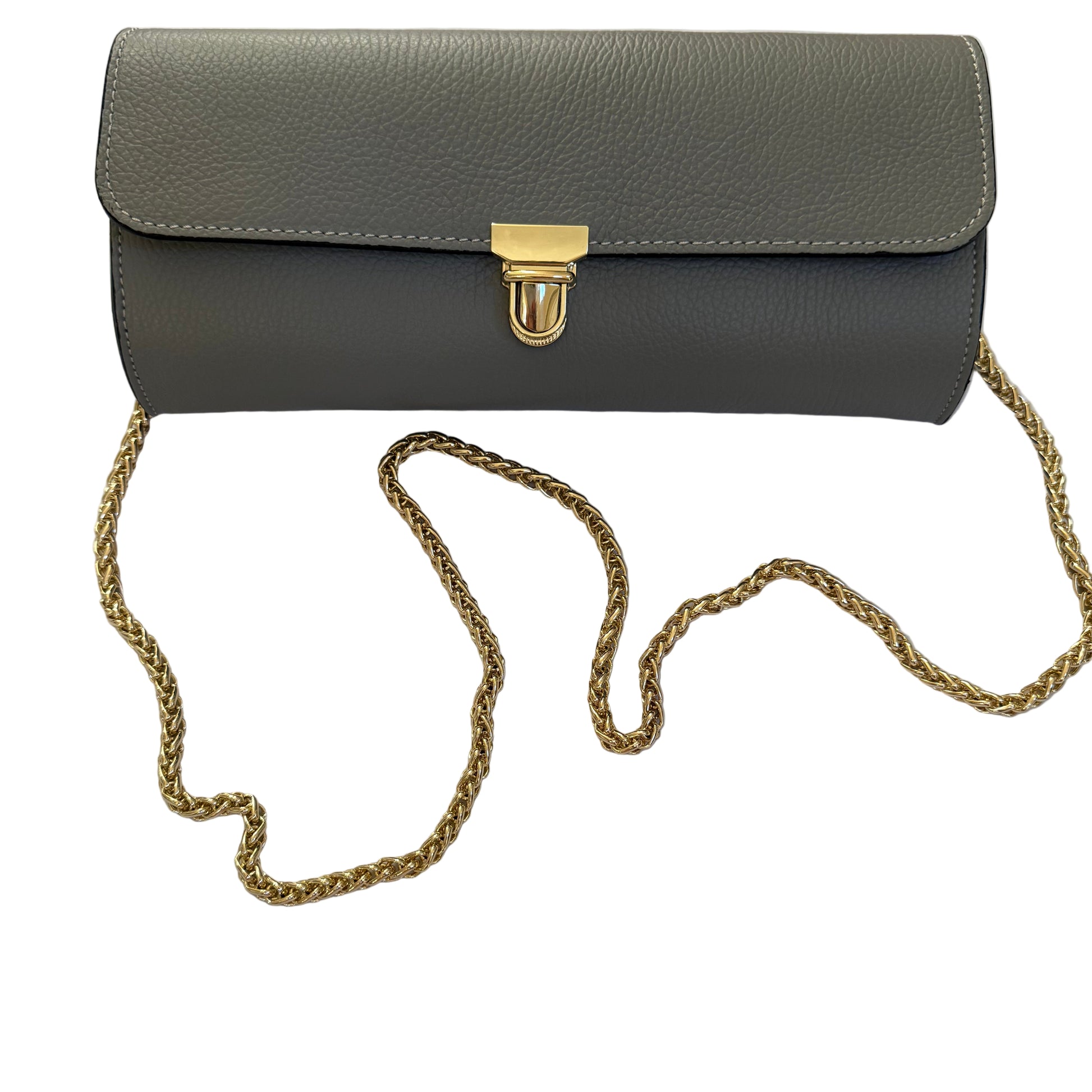 Genuine leather bag featuring removable chain strap and an interior pocket. Stylish and trendy baguette crossbody. Can be worn as a clutch, shoulder bag or a crossbody.