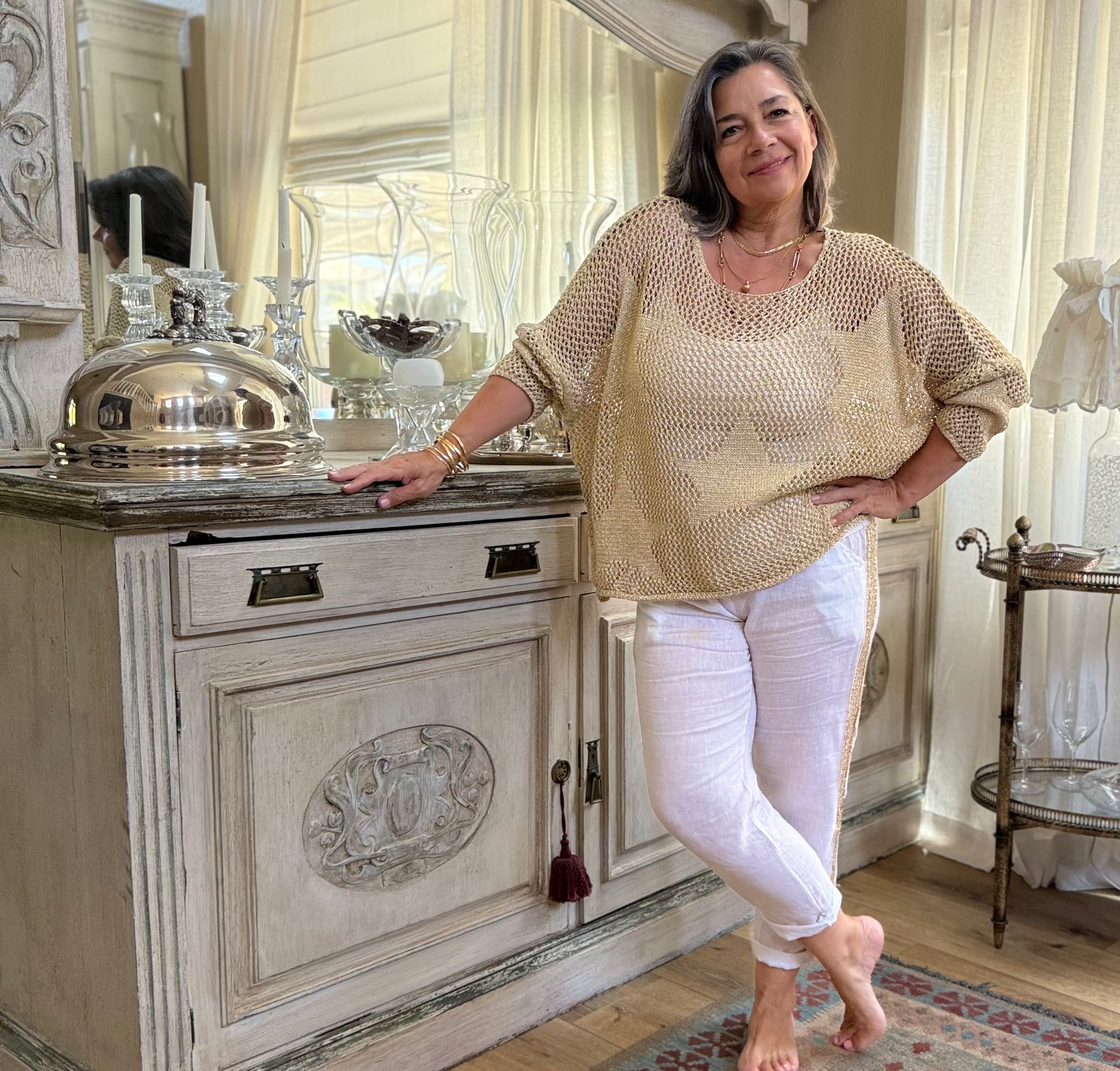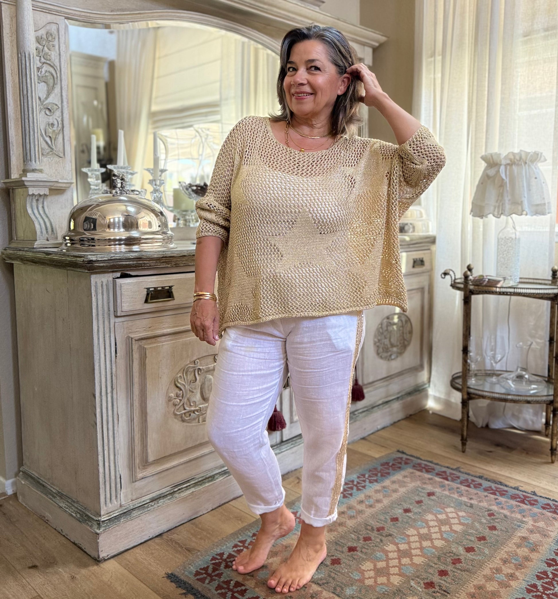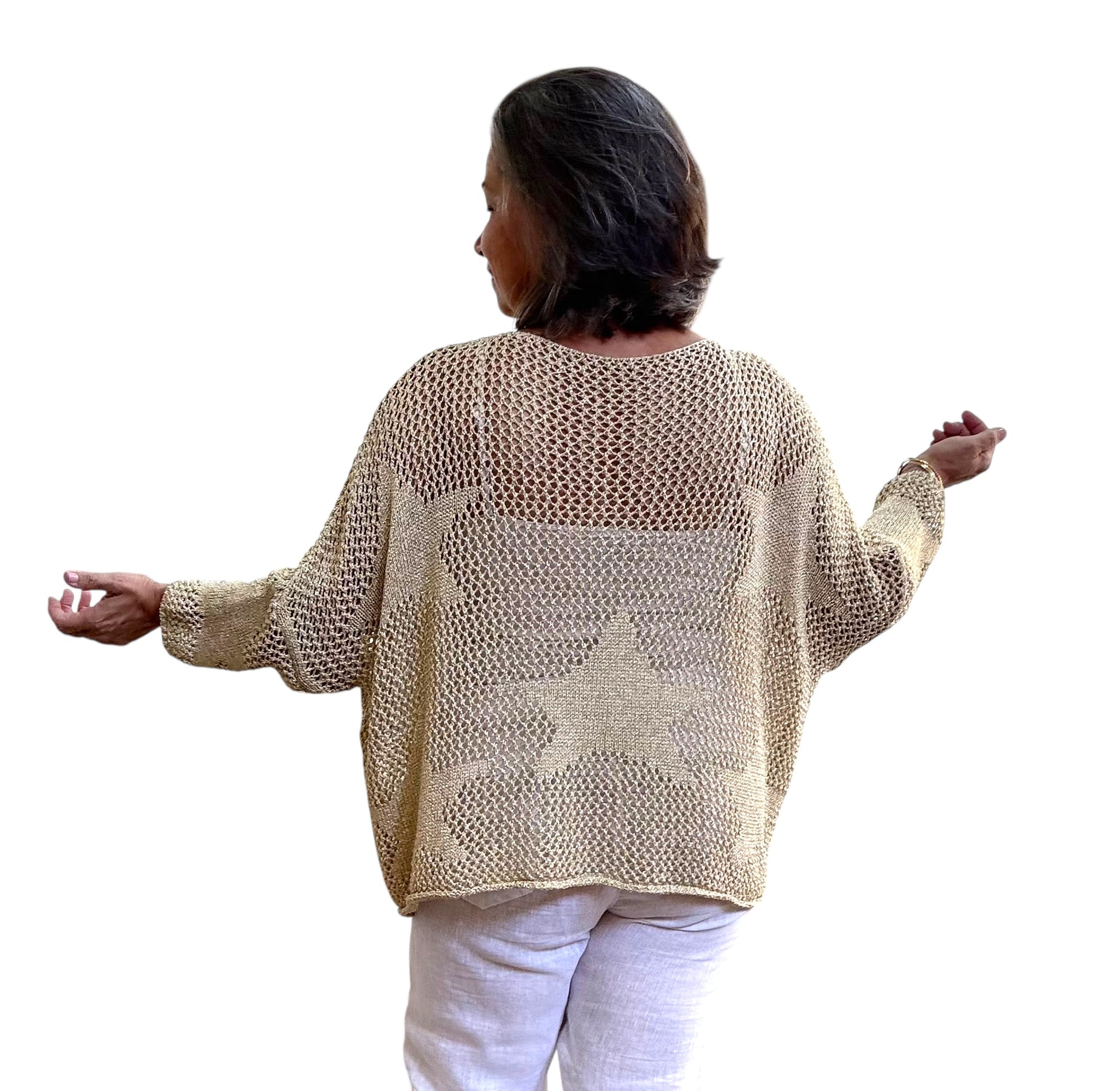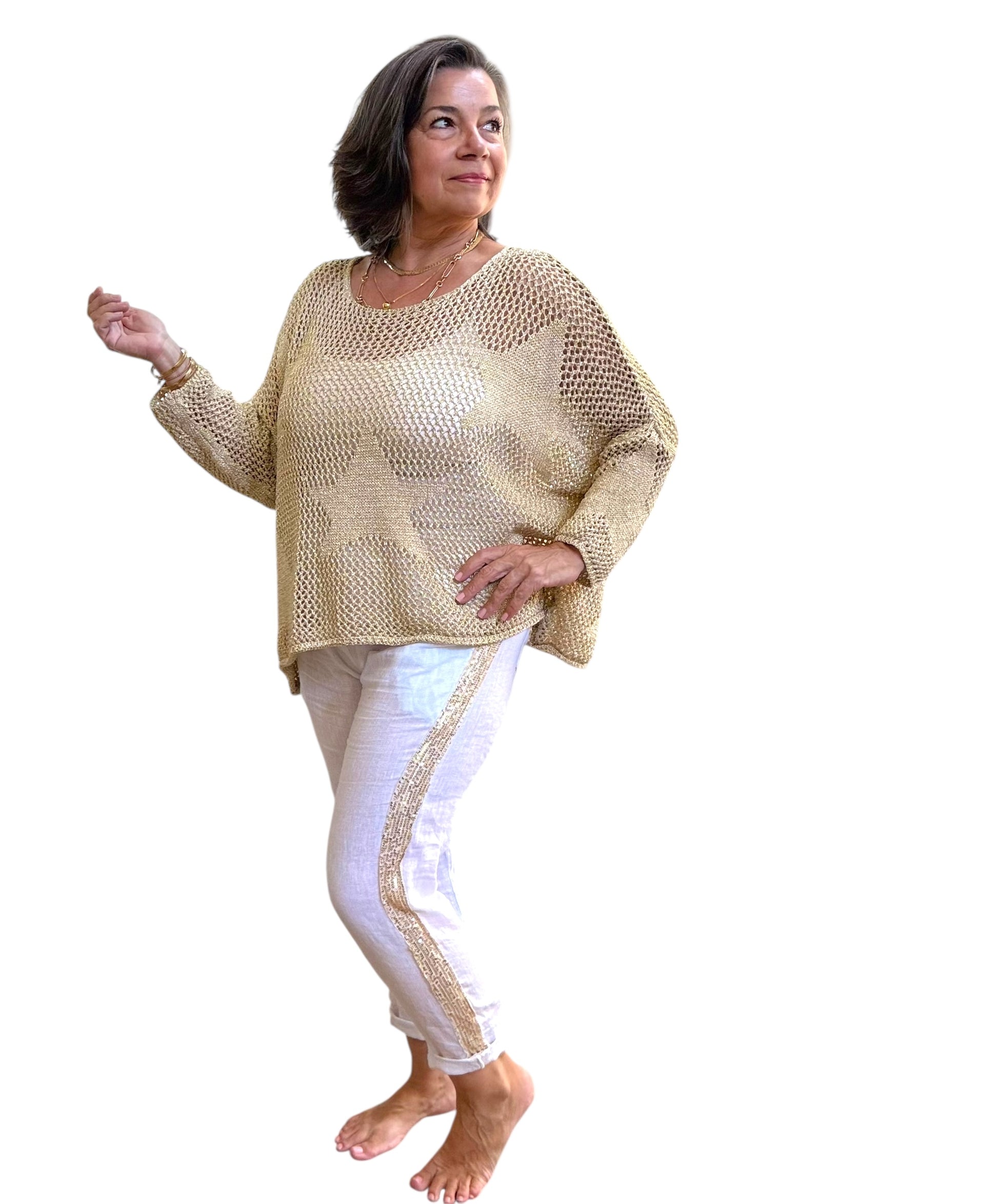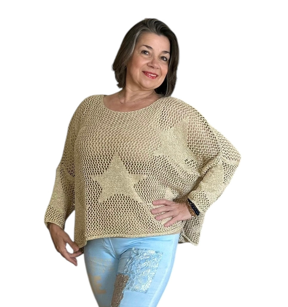 Meet our new metallic gold crochet top, featuring a playful star pattern.