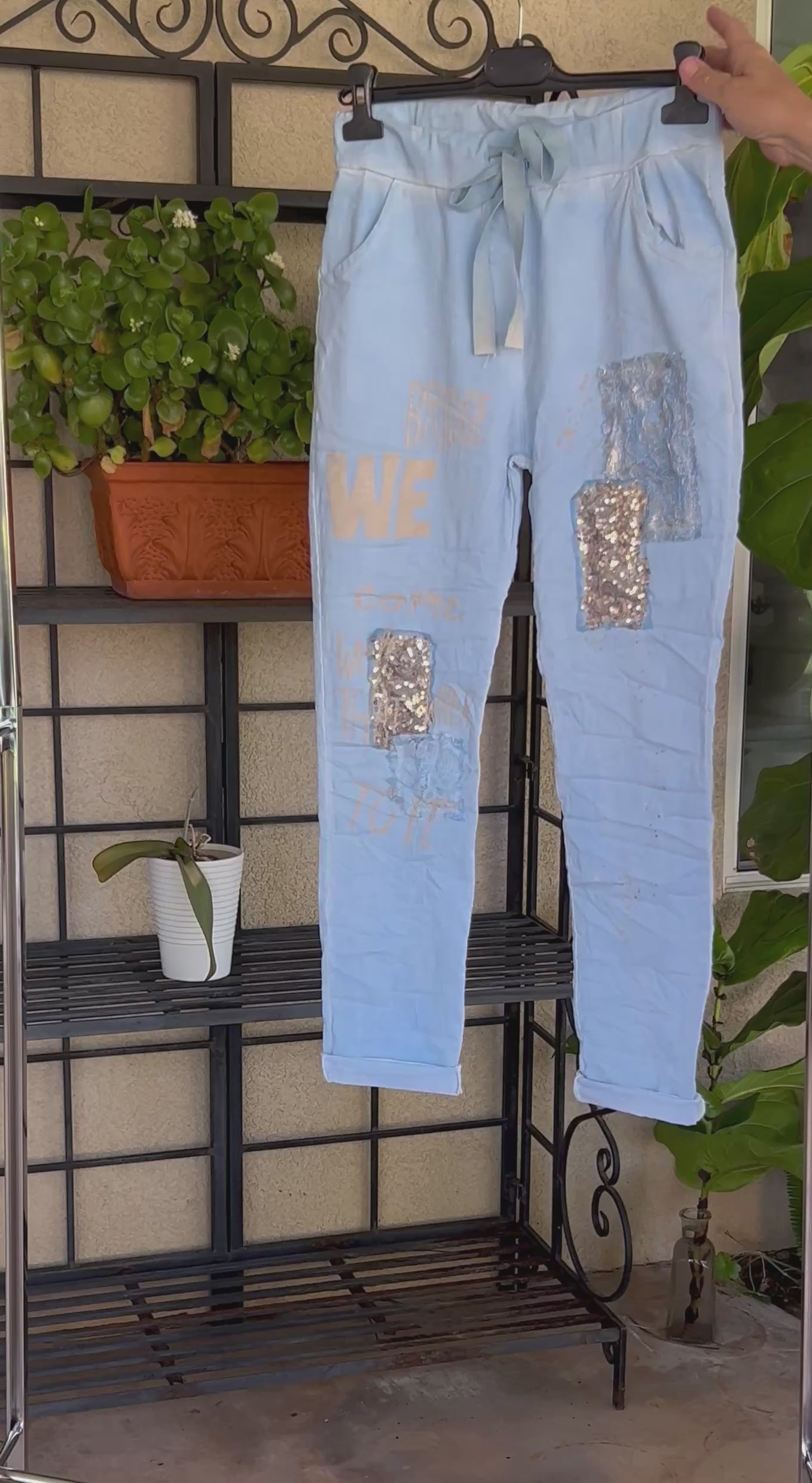 Our Italian pants fit sizes S to L comfortably.