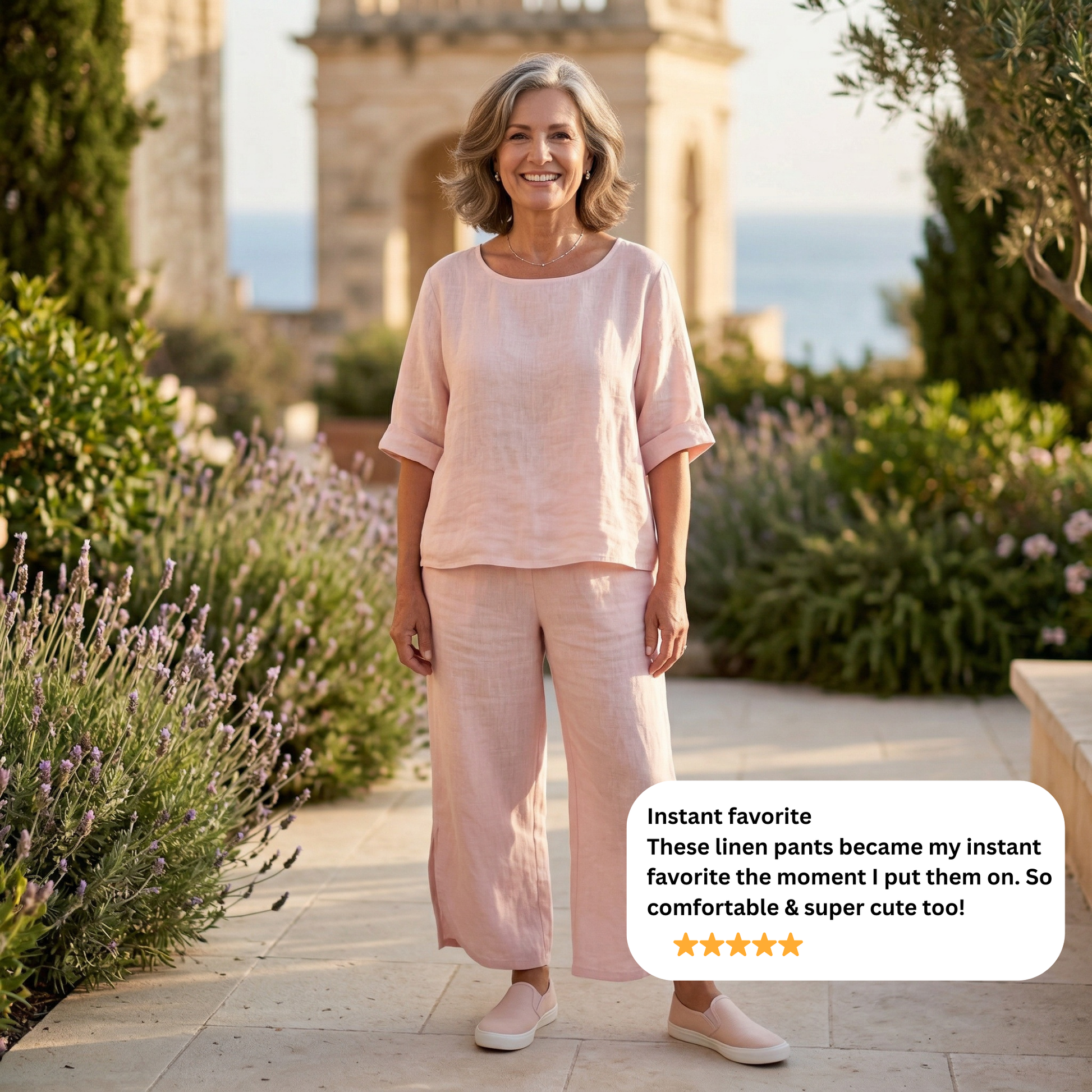 Dressing up or wearing casually is easy as it pairs effortlessly with the Flo linen capri pants, magic pants, or your favorite shorts for a versatile, elegant look.