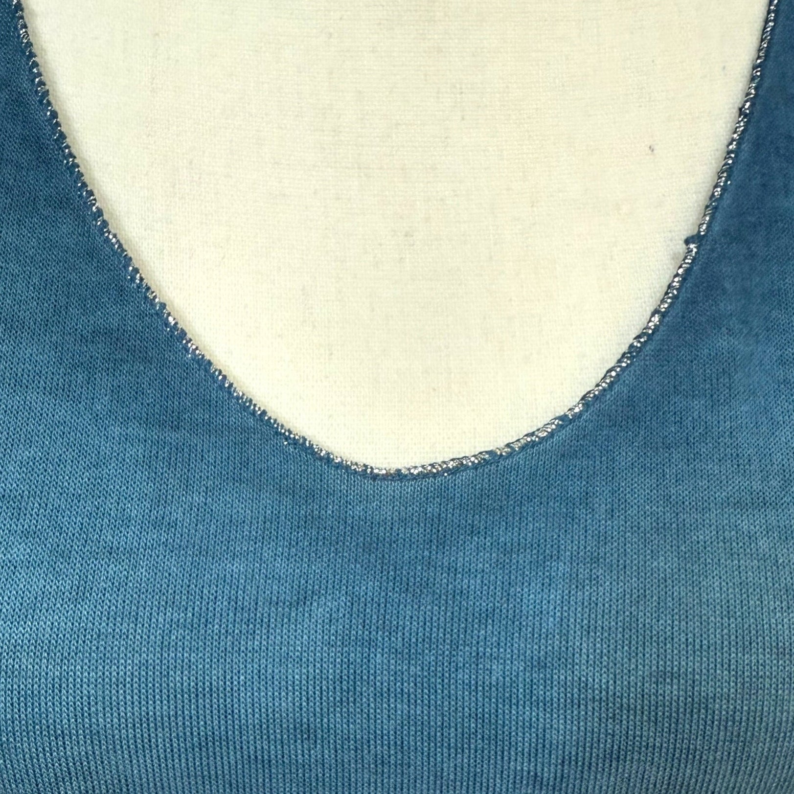 A BEST SELLER, the super soft long sleeved V neck top with metallic silver trim around neck, sleeves and bottom hemline. A basic that is more stylish than the norm of basics.
