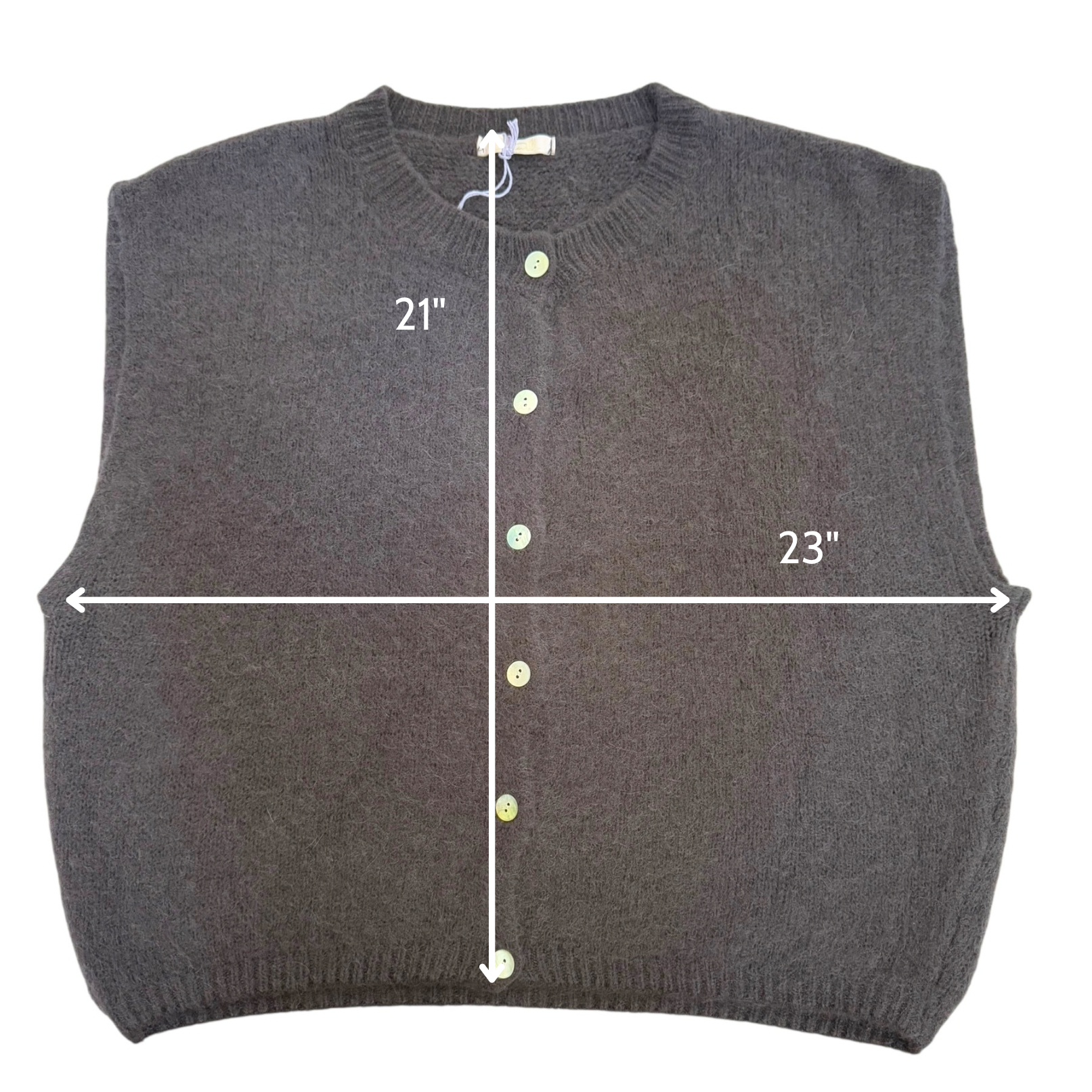 A rich chocolate color sleeveless crew neck sweater top crafted in a luxuriously soft baby alpaca blend. Designed with a loose fit and mother of pearl button front closure, it’s effortlessly chic worn solo & is also a perfect layering piece.