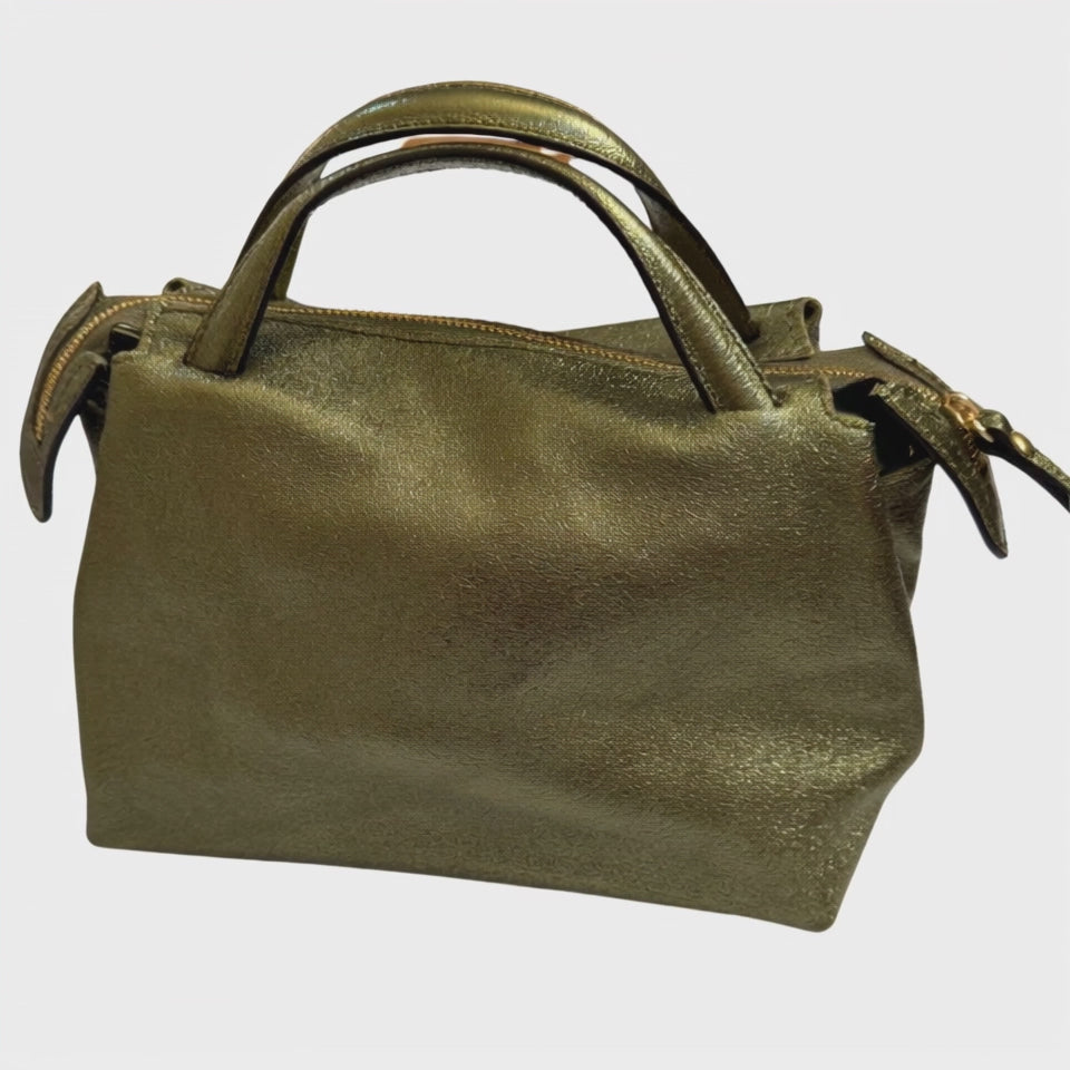 Shimmering metallic green meets Italian craftsmanship in this standout genuine-leather bag. Designed for effortless versatility, it features a zippered top closure and a detachable, adjustable strap so you can wear it as a chic shoulder bag or an easy crossbody. Polished, practical, and beautifully made in Italy — it’s the little statement that elevates every outfit.