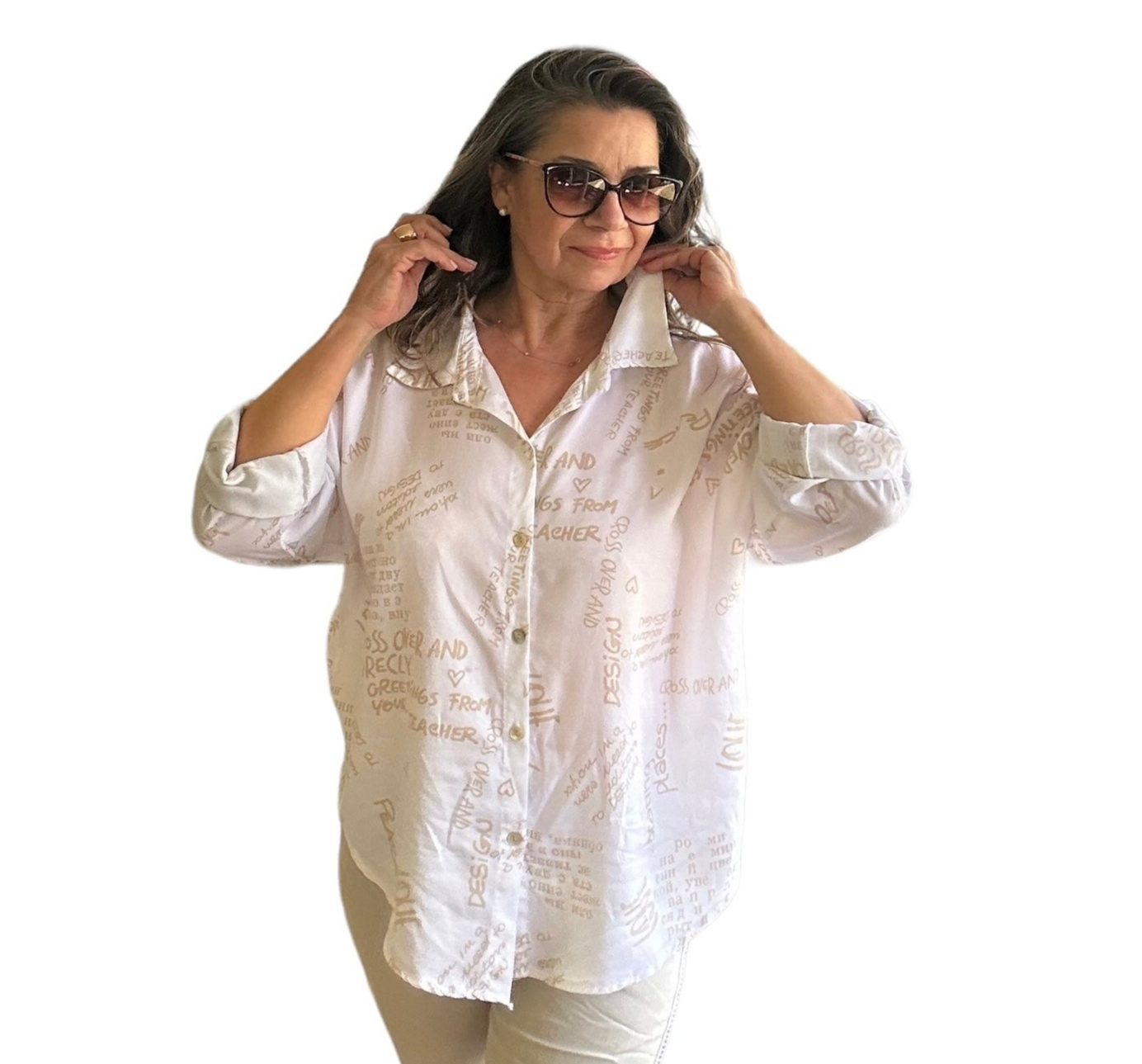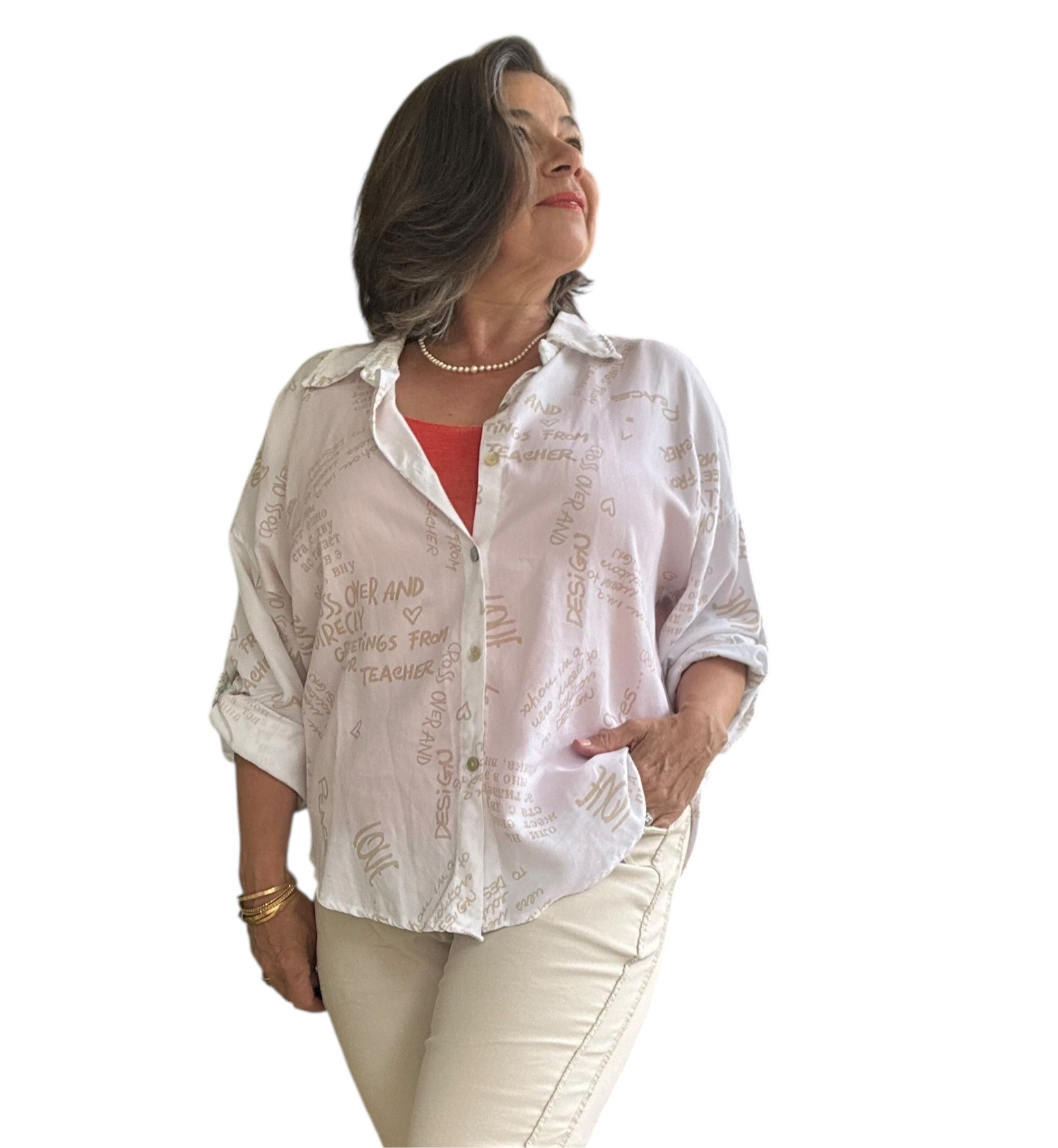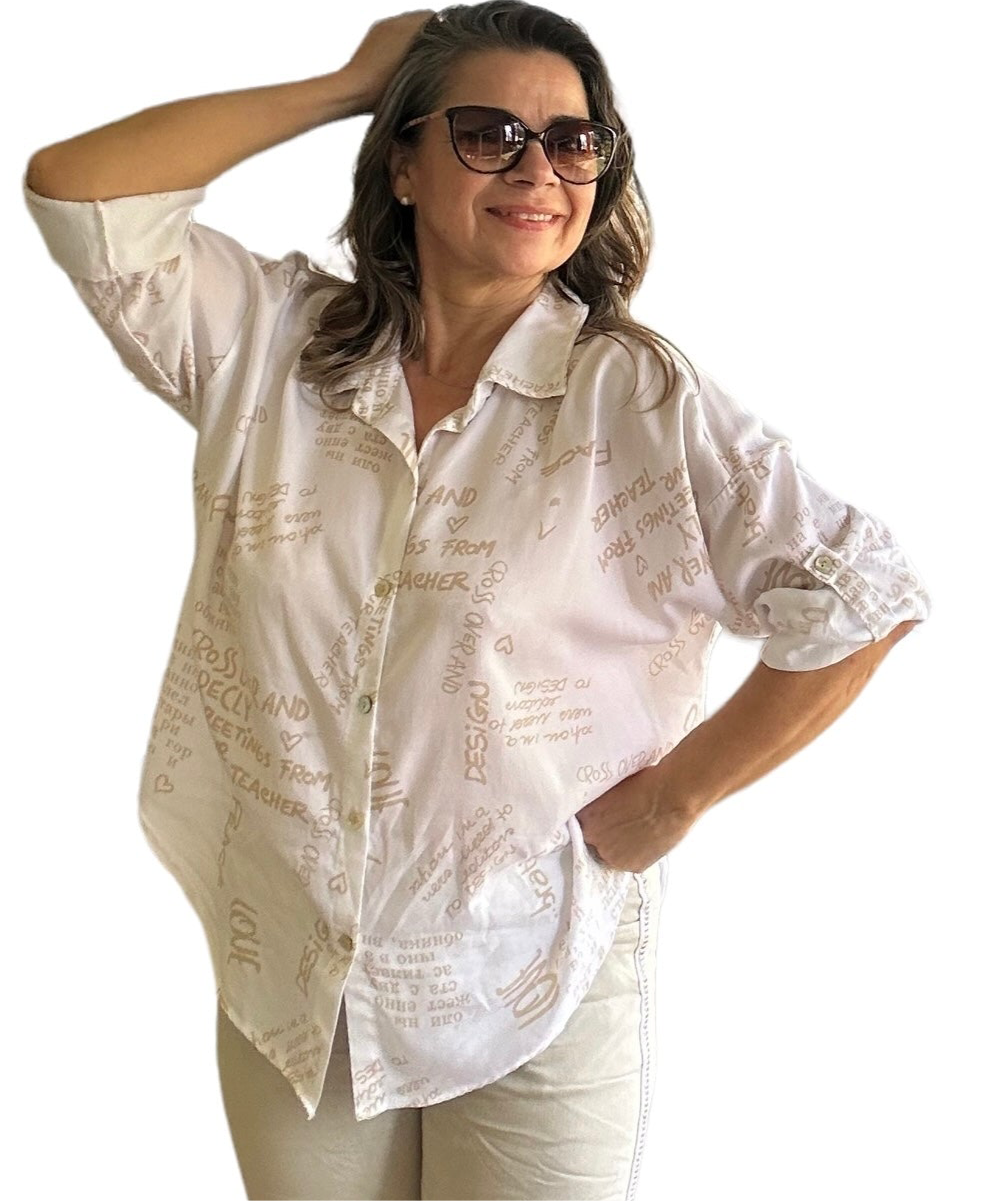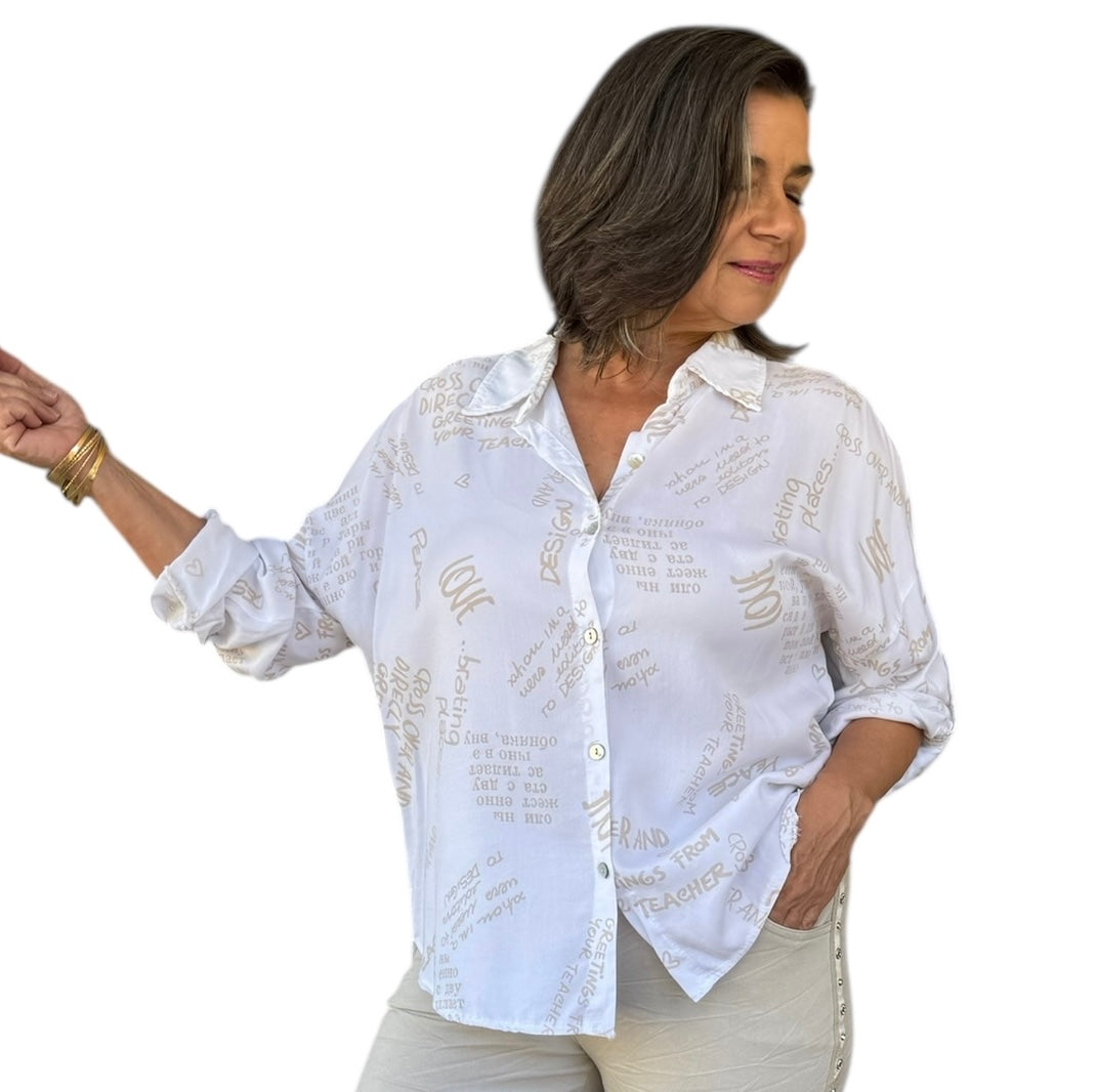 A classic white collared shirt featuring a button-down front, complemented by 3/4 sleeves secured with a button tab.  The shirt boasts an oversized fit and a unique touch with a tan word collage imprint, adding subtle flair to its timeless design.