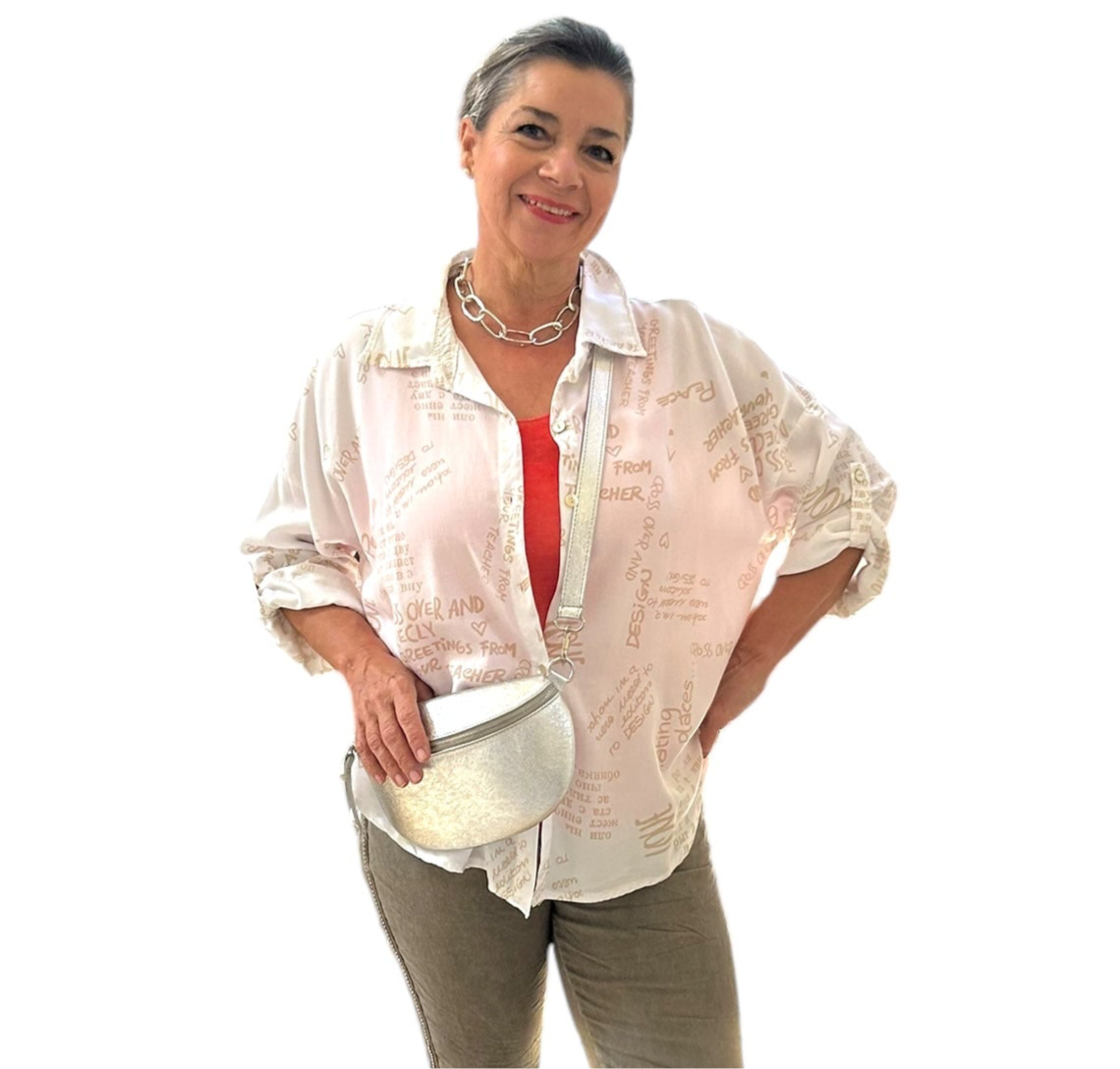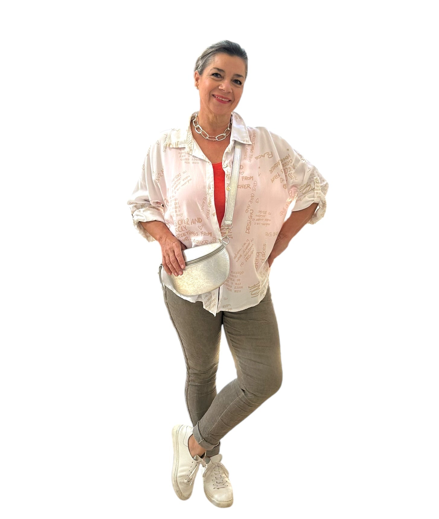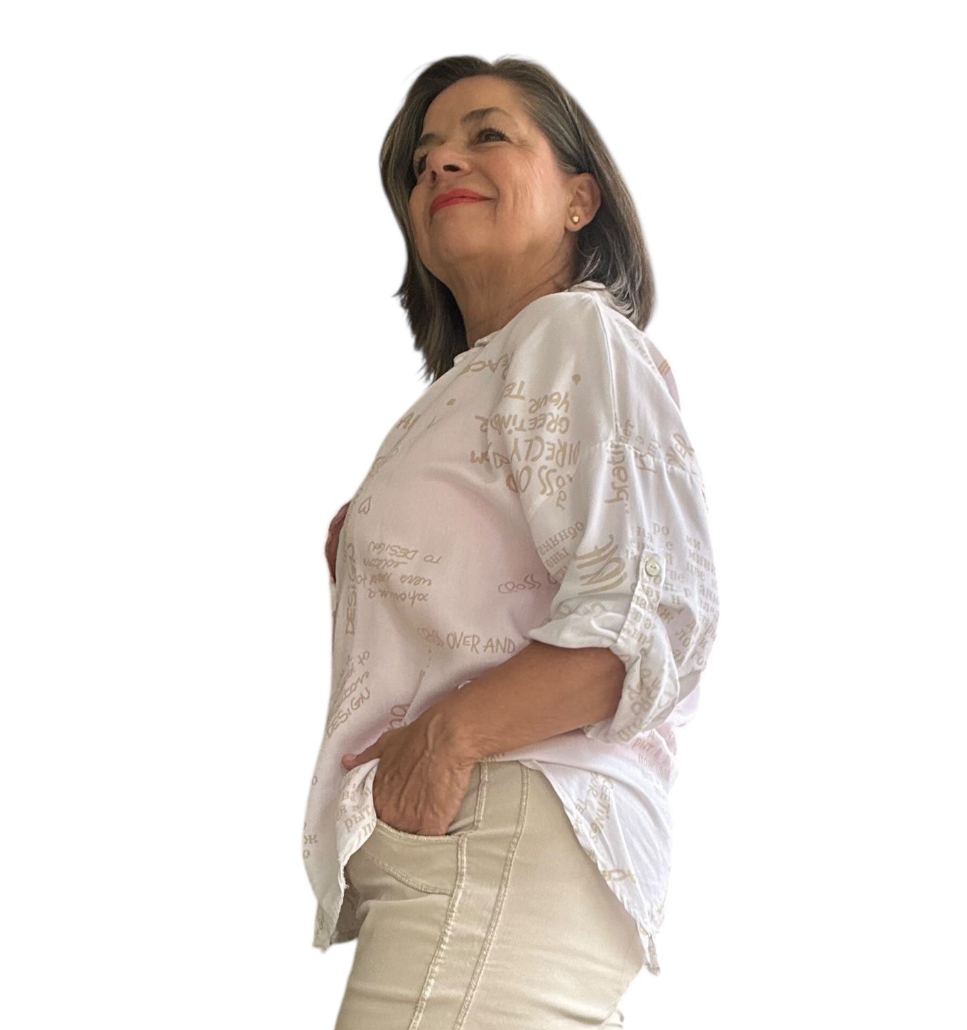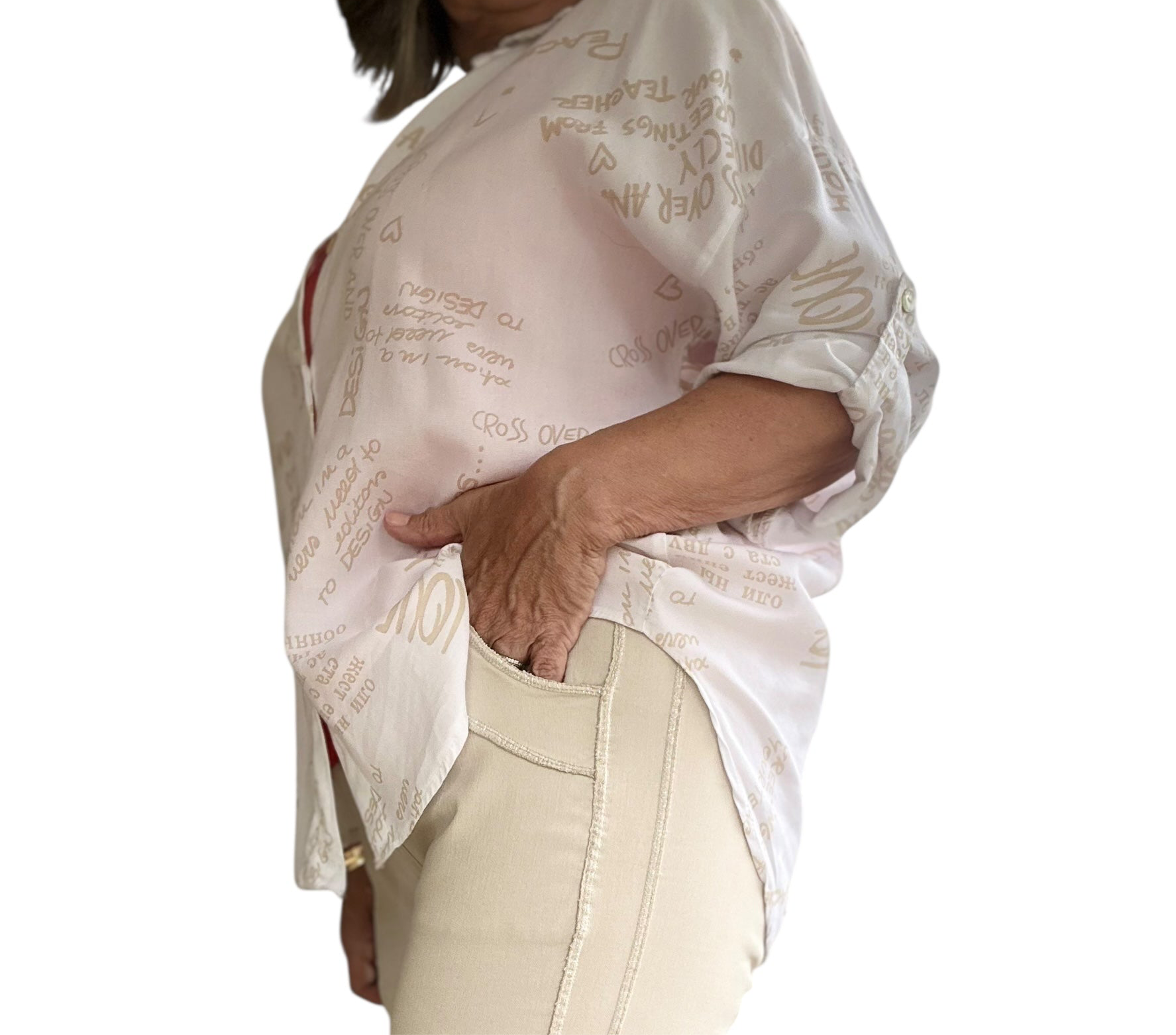 A classic white collared shirt featuring a button-down front, complemented by 3/4 sleeves secured with a button tab.  The shirt boasts an oversized fit and a unique touch with a tan word collage imprint, adding subtle flair to its timeless design.