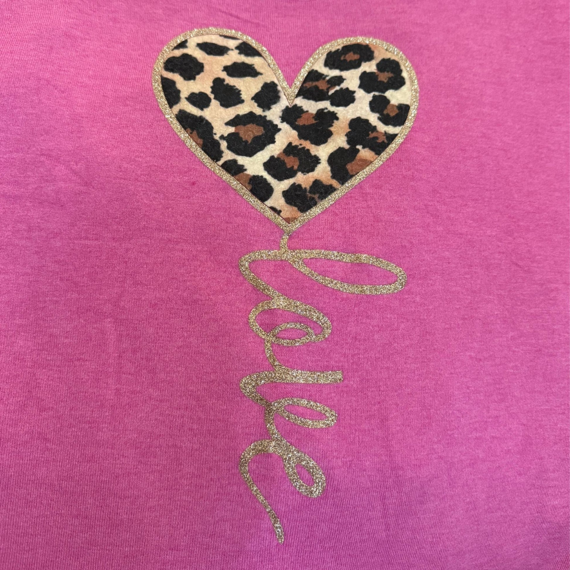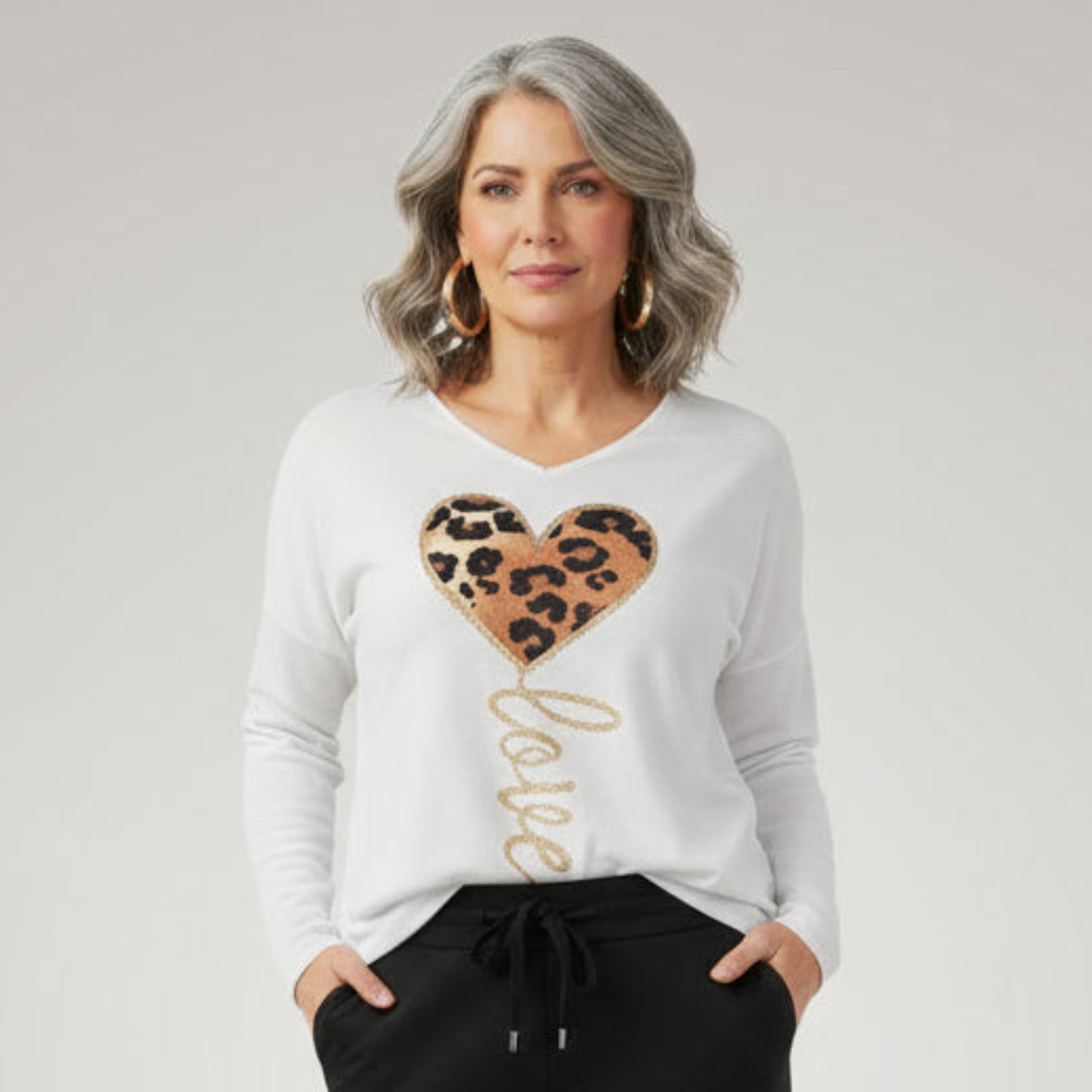 Wrap yourself in softness that feels like a hug. This ultra–soft fleece V-neck brings cozy comfort to your everyday, with a touch of shine that makes it stand out. A soft animal-print heart, outlined in metallic gold, anchors the front — with the word love glimmering just below.
