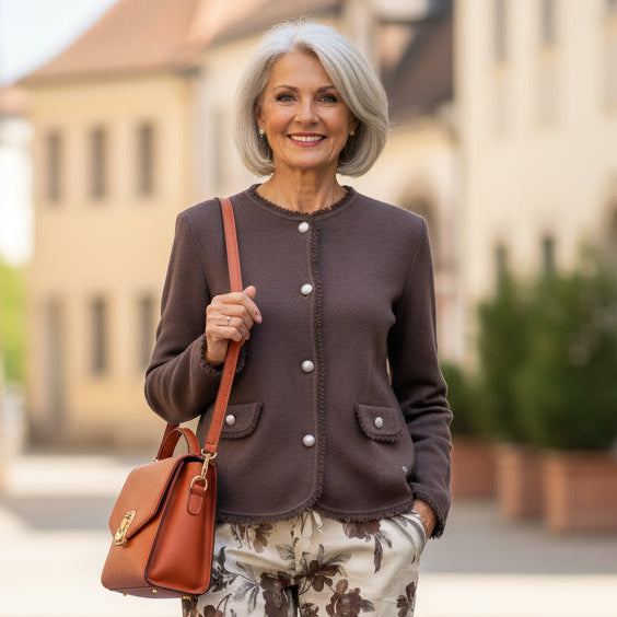 A chic and comfortable long-sleeved cardigan jacket featuring a crew neck, button-down front, and two faux front pockets.