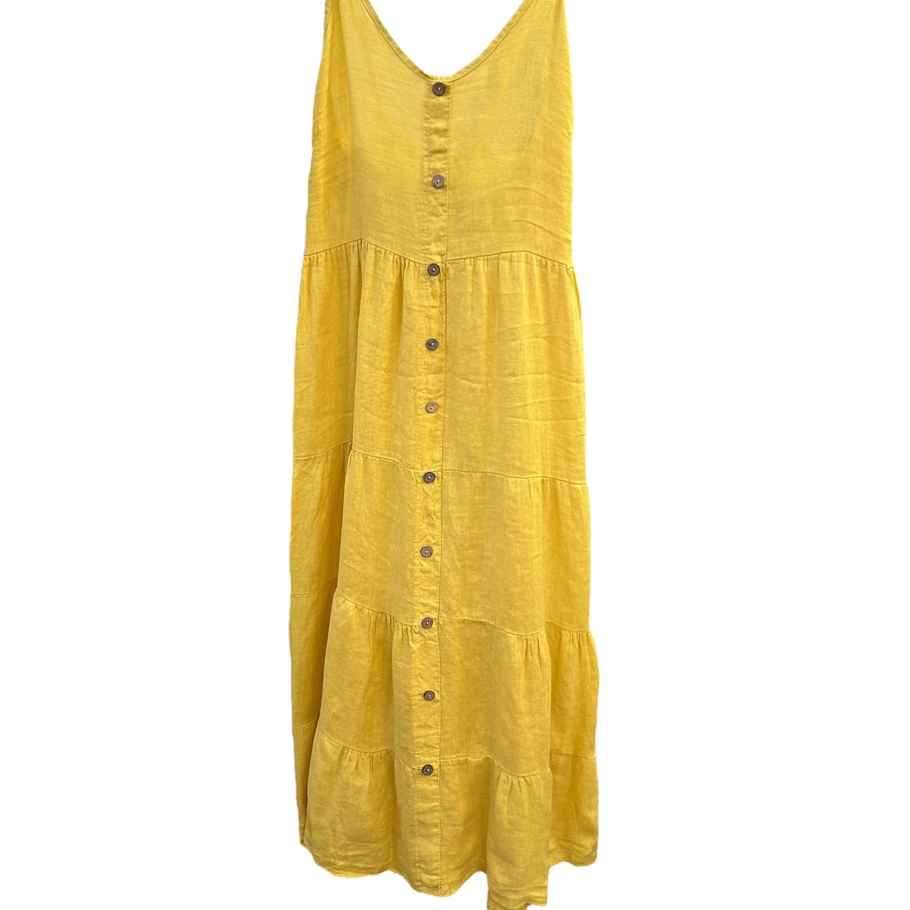 Elegant & chic, this vibrant yellow strappy maxi linen dress features a breezy layered design with bamboo buttons down the front and an elasticated back for a flexible, comfortable fit across sizes.